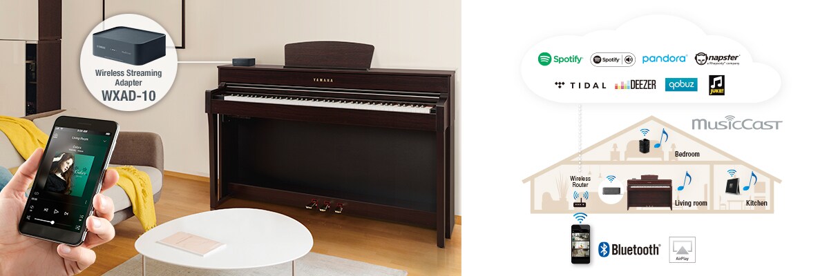 Подключите WXAD-10, чтобы превратить прославленное цифровое фортепиано Yamaha Clavinova в акустическую систему для потокового воспроизведения музыки по сети. Вы сможете легко воспроизводить звук со смартфонов по беспроводной связи на Clavinova и прослушивать различные потоковые сервисы. Кроме того, благодаря поддержке уникальной системы беспроводной передачи музыки MusicCast, разработанной компанией Yamaha, фоновой музыкой можно будет насладиться по всему дому, в любой комнате. Легко воспроизводите содержимое различных потоковых сервисов, используя удобное приложение для смартфона, подыгрывайте любимым композициям на фортепиано и используйте другие увлекательные и расширенные возможности Clavinova.