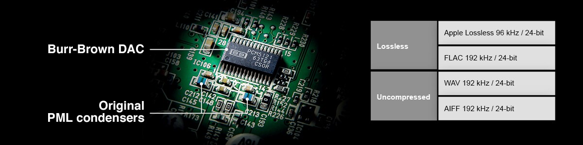 WXAD-10 поддерживает больше количество форматов высокого разрешения, в том числе WAV, FLAC и AIFF с разрешением 192 кГц / 24 бита, а также ALAC с разрешением 96 кГц / 24 бита. Более того, в устройстве используются цифровые схемы специальной конструкции, предназначенной сократить и оптимизировать путь сигнала, и компоненты и технологии наивысшего качества, в том числе знаменитый ЦАП Burr-Brown, оригинальные конденсаторы PML, используемые в AV-ресиверах Yamaha, и фирменная технология Yamaha по совмещению сетевых модулей для уменьшения джиттера. Как результат, устройство позволяет в полной мере раскрыть все преимущества источников звука высокого разрешения, эффективно воспроизводя даже едва заметные звуки, передающие атмосферу концертного зала, и тонкие особенности исполнения, придающие музыке особую выразительность.