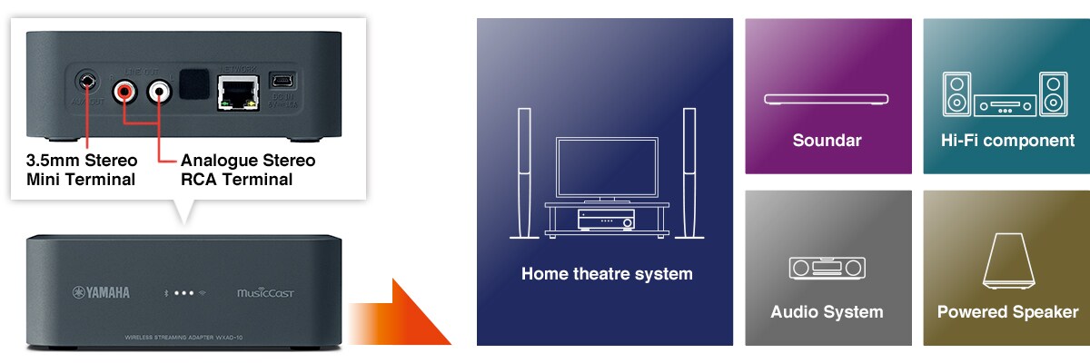 Устройство WXAD-10 оснащено разъемом RCA и стереофоническим выходом Jack 3,5 мм, поэтому его можно подключать к самым различным аудиокомпонентам. Используйте его вместе с полочной акустической системой, компонентом системы Hi-Fi, домашним кинотеатром или даже звуковой панелью. Возможности безграничны.