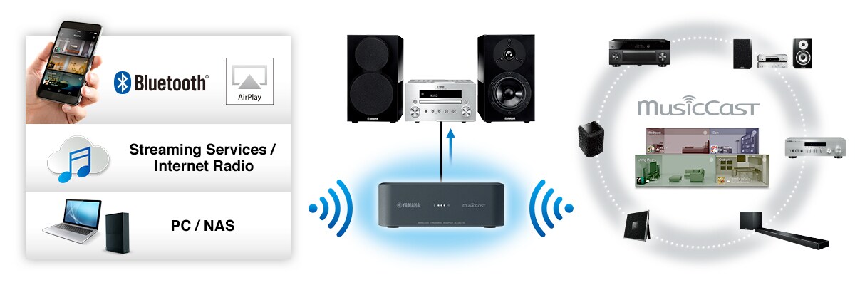 MusicCast — это новая революция в области передачи сетевого аудиоконтента, позволяющая использовать аппараты данной категории вместе или по отдельности. Система полностью управляется из одного интуитивно понятного, быстродействующего и простого в использовании программного приложения. Можно подключить звуковую панель, беспроводную акустическую систему, AV-ресивер, аудиосистему класса HiFi — то, что вам лучше всего подходит; можно комбинировать и взаимно адаптировать различные устройства, равно как и наращивать сформированную вами систему MusicCast с течением времени. Это абсолютно новое решение от Yamaha дает каждому всё необходимое в любое время.