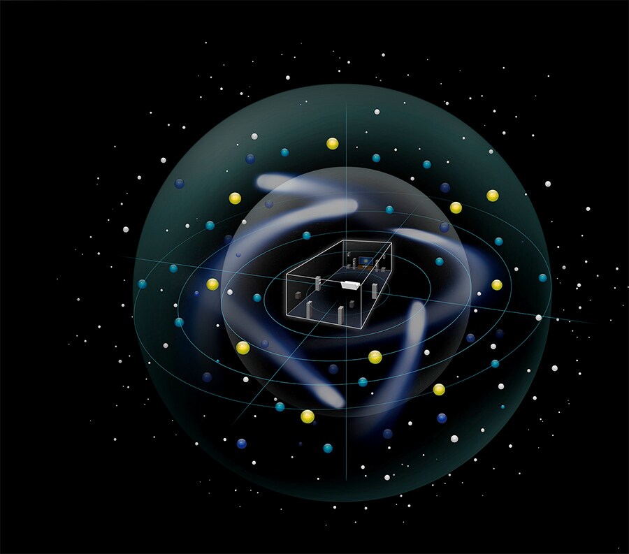 Объектно-ориентированная технология звучания поднимает иллюзию погружения на новые высоты за счет расположенных над головой слушателя акустических систем и точного позиционирования звуков не только вокруг него, а во всем трехмерном пространстве.