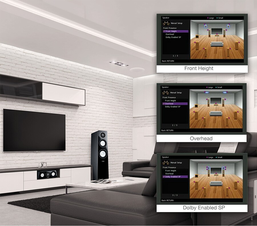 Все варианты полностью применимы на практике, формируя трехмерное окружение звуком по технологиям CINEMA DSP и Dolby Atmos.