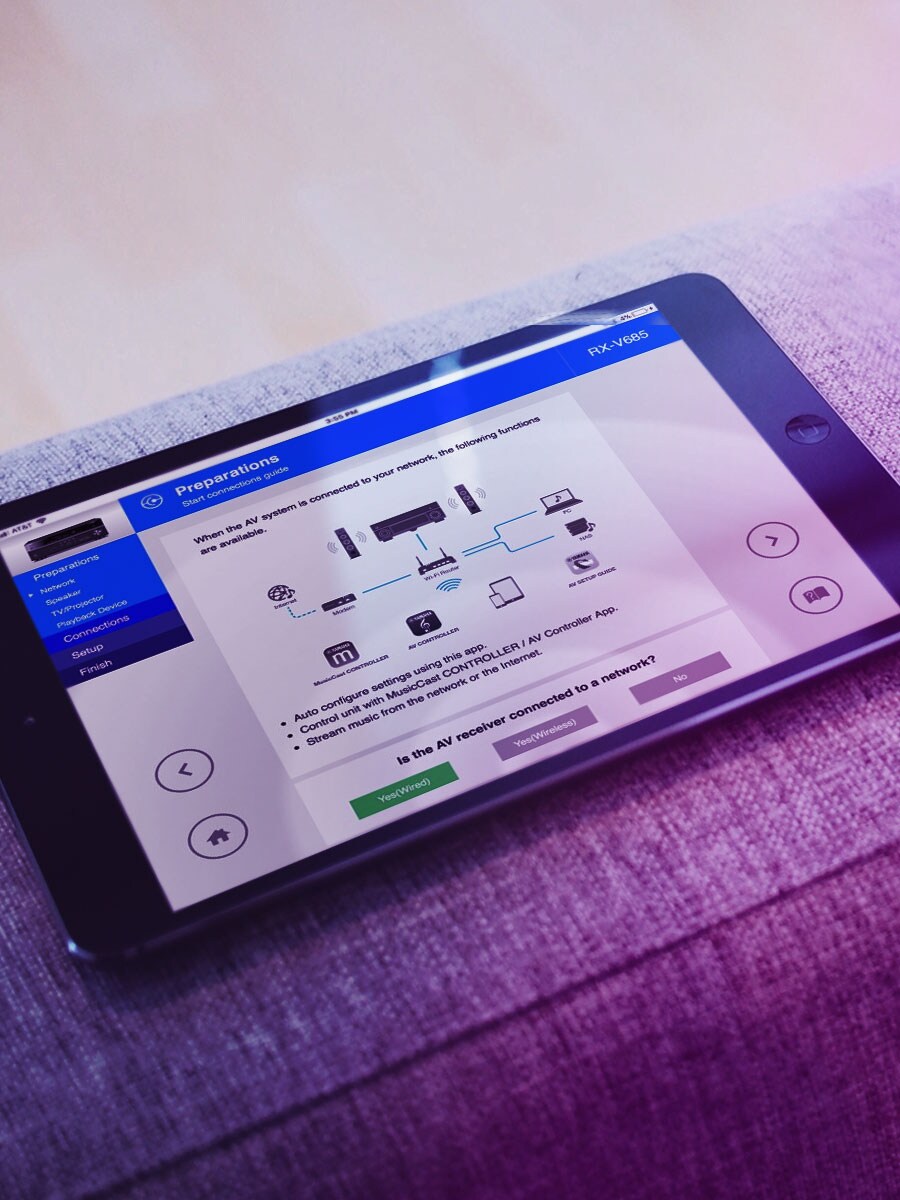 Никаких затруднений, никакой неразберихи. Используя это специальное приложение, вы получите профессиональную консультативную помощь по кабельным соединениям между AV-ресивером и устройствами-источниками. Полезная информация имеется и по таким аспектам, как подключение акустических систем, телевизора и источников сигнала, а также назначение усилителя мощности.