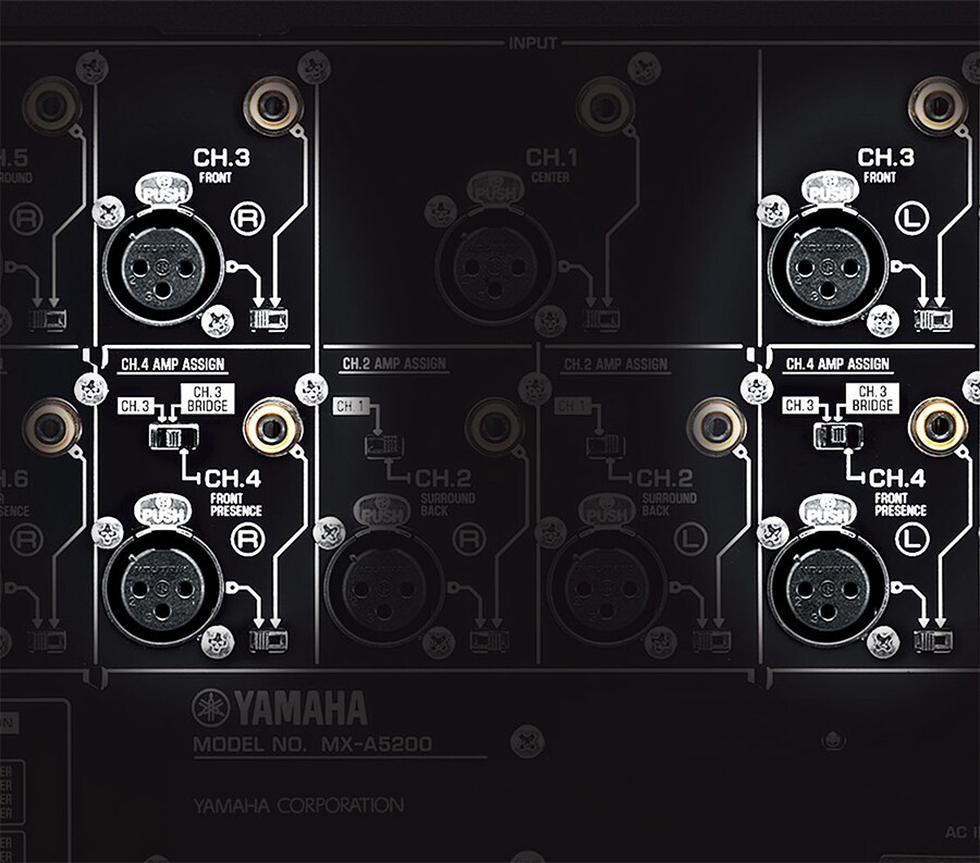 Для дальнейшего увеличения мощности MX-5200 поддерживает мостовое включение 2 передних каналов. Это позволяет значительно улучшить качество звука передних акустических систем.