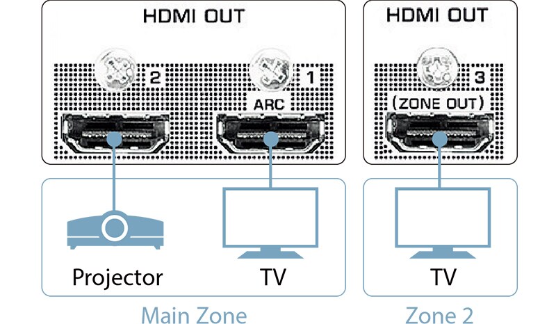 Поскольку модель RX-A2080 оснащена тремя выходами HDMI, к устройству можно подключить одновременно телевизор, ЖК-проектор и другие устройства. Например, вы можете использовать телевизор как обычно, а на проекторе смотреть любимые фильмы и трансляции, или же отображать содержимое из основной комнаты в других комнатах. Все это возможно в любое время и без необходимости менять какие-либо подключения. Само собой, поддерживаются самые новые спецификации HDMI, включающие HDR (Dolby Vision Compatible, Hybrid Log-Gamma), передачу 4K-видео с частотой 60 к/сек и масштабирование до 4K.
