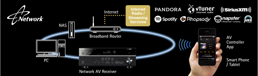 Этот AV-ресивер поддерживает целый ряд сетевых функций, дающих доступ к внешним источникам контента и расширяющим функциональные возможности. Ресивер можно подключить к домашней сети или Интернету для прослушивания Интернет-радио наряду с сервисами Spotify*, Pandora®*, JUKE*, Napster®*, Rhapsody®*, SiriusXM* или музыкальными файлами из сетевого хранилища и домашнего ПК. Приложение AV Controller (из магазина приложений iTunes App Store или Google Play) позволяет управлять различными функциями с телефонов iPod, iPhone, iPad или Android / планшетов.