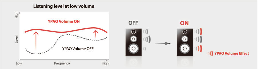 Человеческий слух менее чувствителен к верхним и нижним частотам при малой громкости. Функция YPAO Volume основана на применении автоматической тонкомпенсации — подстройки уровней верхних и нижних частот под изменения громкости. Используя результаты измерений, выполненных системой YPAO, тонкомпенсация оптимизируется под установки параметров аудиосистемы и среду прослушивания.