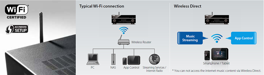 Встроенная функция Wi-Fi обеспечивает беспроводное соединение с домашним беспроводным маршрутизатором, значительно упрощая системные подключения к сервисам потоковой трансляции аудио- и музыкального контента. Если Wi-Fi-маршрутизатор отсутствует, то уникальная функция Wireless Direct позволяет не только осуществлять потоковую передачу музыки со смартфона или планшета при помощи функции Music Play приложения AV Controller, функции AirPlay из iOS и т.п., но и управлять ресивером с использованием приложения AV Controller.
