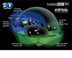 Технология CINEMA DSP 3D обеспечивает формирование широкого, высокого и плотного звукового поля. Декодирование формата HD Audio позволяет прослушивать музыкальные записи высокой четкости. Технология Virtual Presence Speaker обеспечивает трехмерное звучание без фактического использования АС присутствия.