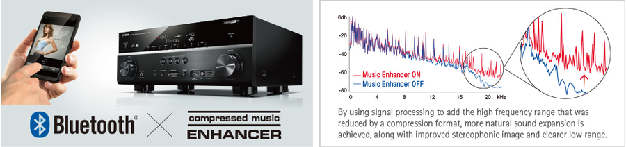 Кодирование музыки в цифровом формате со сжатием данных (например, МР3) ведет к ограничению диапазона воспроизводимых частот. Разработанная компанией Yamaha функция Compressed Music Enhancer выполняет сложную обработку цифрового сигнала с использованием уникальных алгоритмов с целью восстановления утраченной информации. В результате музыка всегда будет звучать так, как было задумано композитором.