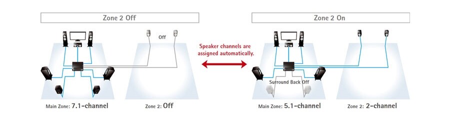 Режим Intelligent Amp Assign автоматически назначает каналы усилителя акустическим системам в зависимости от выбранных функций. Например, когда в 7.1-канальной системе отключена зона 2, все 7.1 каналов можно использовать в главной зоне. Однако, когда зона 2 включена, мощность для двух тыловых окружающих каналов подается на две АС в зоне 2, а в главной зоне используется мощность для 5.1 каналов. Точно так же, когда включен режим CINEMA DSP 3D, мощность подается на две фронтальных АС присутствия, а не на две тыловые АС окружающего звучания. При выключенном режиме CINEMA DSP 3D ситуация принимает обратный характер. Благодаря функции Intelligent Amp Assign не надо извлекать акустические кабели из одних разъемов на задней панели и вставлять в другие – так Yamaha хоть немного, но облегчает жизнь пользователю.