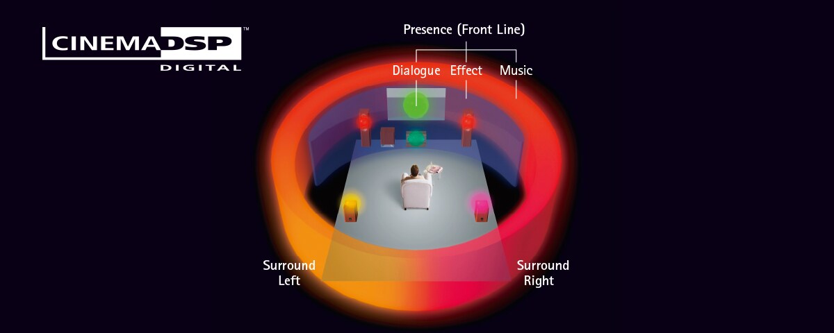 Виртуальный режим CINEMA FRONT обеспечивает виртуальное 5-канальное окружающее звучание с высоким качеством и разрешением