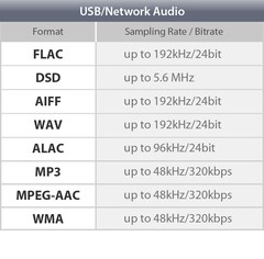- Воспроизведение форматов DSD 2,8 МГц / 5,6 МГц, FLAC / WAV / AIFF 192 кГц / 24 бит, Apple Lossless 96 кГц / 24-бит