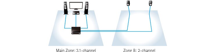 Ресивер способен передавать 2-канальный сигнал в другую зону. Таким образом, для главной зоны остается 5 каналов. Это означает, что теперь вы можете прослушивать стереофонический звук и во второй комнате. В обеих зонах будет воспроизводиться материал из одного и того же источника (использование двух источников сигнала невозможно).