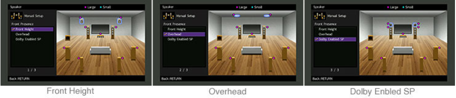 Компания Yamaha предлагает несколько вариантов расположения акустических систем присутствия, которые, поддерживая формат Dolby Atmos, создают идеальное звуковое поле для конкретной заданной конфигурации. Все варианты применимы на практике, позволяя формировать трехмерное звуковое окружение по технологиям CINEMA DSP и Dolby Atmos.