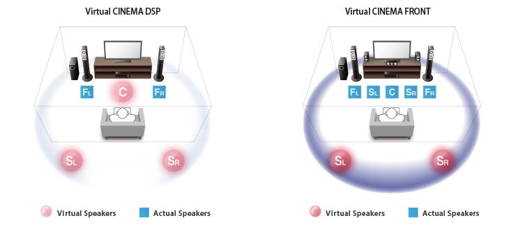 Даже если акустические системы окружающего звучания невозможно установить за позицией прослушивания, режим Virtual CINEMA DSP воспроизводит реалистичный виртуальный 5-канальный объемный звук при использовании всего лишь двух фронтальных АС. Режим Virtual CINEMA FRONT позволяет разместить спереди две АС окружающего звучания и центральную АС, чтобы наслаждаться виртуальным 5-канальным объемным звуком более высокого качества и разрешения, а также превосходной локализацией звука виртуальных задних АС. Добавление двух дополнительных фронтальных АС присутствия обеспечивает трехмерное звуковое поле наряду с ощущением высоты, глубины и вертикального перемещения звука. Вы получаете дополнительную гибкость размещения акустических систем в комнате и более качественный объемный звук без дополнительных затрат.