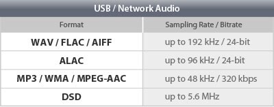 - Воспроизведение форматов DSD 2,8 МГц / 5,6 МГц, FLAC / WAV / AIFF 192 кГц / 24 бит, Apple Lossless 96 кГц / 24-бит