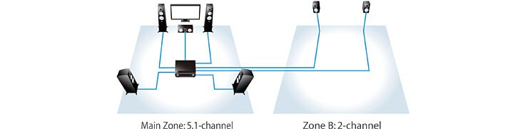 Zone B output capability allows the receiver to send 2-channel sound to a second zone, so the main zone now has 5-channel output. This means that users can enjoy stereo sound in a second room. The same source will play in both zones (cannot use two sources).