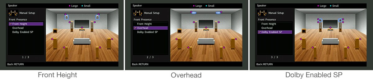 Компания Yamaha предлагает несколько вариантов расположения акустических систем присутствия, которые, поддерживая формат Dolby Atmos, создают идеальное звуковое поле для конкретной применяемой конфигурации АС. Все варианты полностью применимы на практике, формируя трехмерное окружение звуком по технологиям CINEMA DSP и Dolby Atmos.