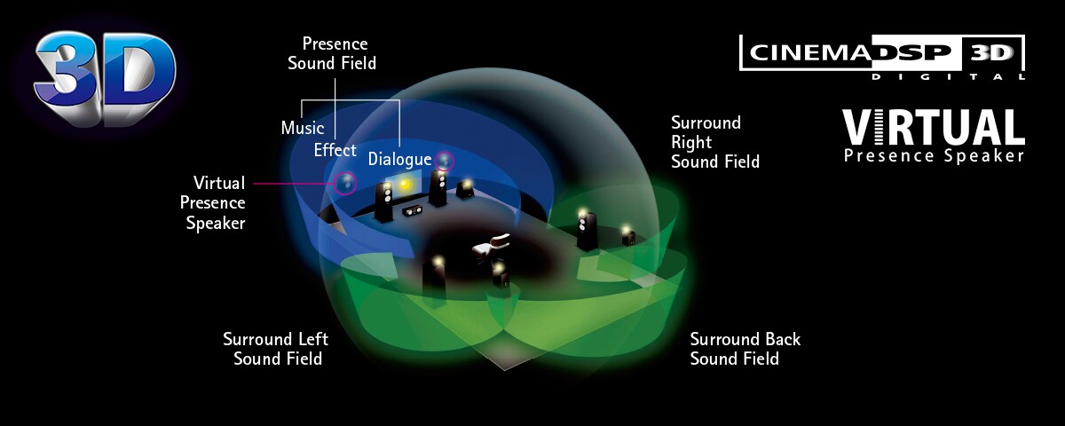 Технология CINEMA DSP 3D обеспечивает формирование широкого, высокого и плотного звукового пространства. Декодирование формата HD Audio позволяет прослушивать музыкальные записи высокой четкости. Технология Virtual Presence Speaker обеспечивает трехмерное звучание без использования АС присутствия.