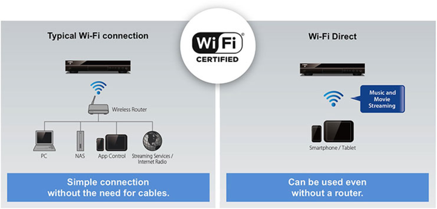Wi-Fi built in capability allows wireless connection with your household wireless router, greatly simplifying system connections to enjoy network audio and music streaming services. You can control your Blu-ray Disc Player using the AV Controller app or MusicCast app. If no Wi-Fi router is available, the Wi-Fi Direct feature allows you to stream music and movie directly from your mobile device.