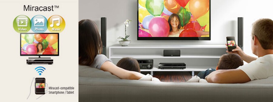 This Blu-ray Disc Player is compatible with Miracast, a wireless standard that lets you connect any Miracast compatible smartphone or tablet for mirroring videos and photos to the player, so the whole family can view them on a widescreen TV. When using a Yamaha AV receiver, you'll enjoy a variety of media mirrored via Miracast with dynamic sound.