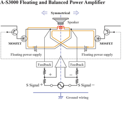 В основу конструкции положена фирменная технология беспотенциального симметричного усилителе мощности. Использование выходных элементов с одинаковой полярностью на положительной и отрицательной сторонах выходного каскада, а также разделение цепей отрицательной обратной связи (ООС) и блока питания в общей сложности на четырех положительных и отрицательных полюсах левого и правого каналов обеспечивает симметричное двухтактное функционирование выходного каскада. Полная изоляция усилителя мощности от «земли» устраняет все отрицательные последствия от малейших отклонений напряжения или помех на шине заземления. Кроме того, выходные элементы включают МОП-транзисторы, которые обеспечивают теплое и естественное звучание. Использование МОП-транзисторов с одинаково распределенной полярностью развивает идею полностью симметричной конструкции с целью устранения неравномерности качества аудиосигнала за счет разницы в полярности — именно это является основной особенностью беспотенциального симметричного усилителя мощности. В результате достигается звучание с отличным отношением сигнал-шум и четко определенным звуковым полем.