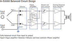 A-S3000 обеспечивает полностью симметричную передачу сигнала. Кроме того, абсолютно симметрично функционируют цепи контроля (громкость, тембр и т.д.) предусилителя, реализуя тем самым идею идеальной симметрии во всех каскадах.