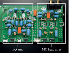 Схема усиления для проигрывателя грампластинок состоит из предварительного усилителя типа MC и усилителя частотного корректора, каждый из которых имеет дискретную конфигурацию, благодаря чему достигается насыщенное звучание с выраженной музыкальностью при воспроизведении виниловых пластинок проигрывателями с головками звукоснимателя обоих типов — MC (с подвижной катушкой) и MM (с подвижным магнитом).