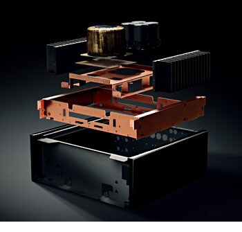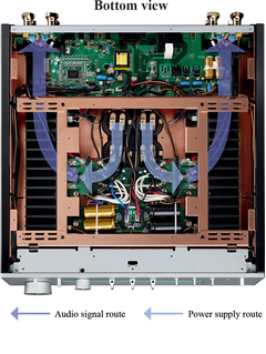Конструкция предусматривает использование независимых блоков предусилителя и усилителя мощности и идеально симметричную компоновку схем в левой и правой части внутреннего пространства. Отделение предусилителя, который имеет дело с сигналами малой мощности, от усилителя мощности, где присутствует высокое напряжение, значительно снижает уровень шума в звуке, вызываемый взаимными помехами. Кроме того, симметричная конструкция полностью изолированных друг от друга левой и правой секций, обеспечивает лучшее разделение каналов и повышает четкость стереофонических образов.