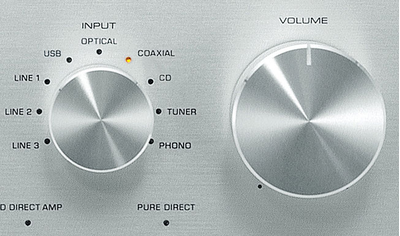 Этот поворотный переключатель позволяет быстро и легко выбирать источники входного сигнала. Его роскошная «волосяная» отделка обеспечивает приятные тактильные ощущения. Светодиодные индикаторы указывают на выбираемые источники сигнала, которые благодаря этому можно легко переключать даже в темноте.