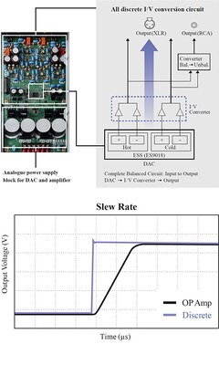 Для полного устранения потерь аудиосигнала в CD-S3000 использована инновационная конфигурация аналоговой схемы. Обычно из ЦАПа выводится аналоговый сигнал, проходящий через схему преобразования ток-напряжение многокаскадной конфигурации. Однако в CD-S3000 вывод сигнала осуществляется с использованием однокаскадной конфигурации на основе дискретной схемы преобразования ток-напряжение. Такая конфигурация с ее высокой скоростью нарастания выходного напряжения, в отличие от многокаскадной, уменьшает потери аудиосигнала и снижает уровень отрицательной обратной связи (ООС), способствуя формированию естественного пространственного звука. Другие схемы после ЦАПов являются симметричными и маркированы знаками плюс и минус. Благодаря симметричному соединению с беспотенциальным симметричным усилителем A-S3000 достигается чистое звучание без потерь, которые обычно возникают при передаче сигнала.
