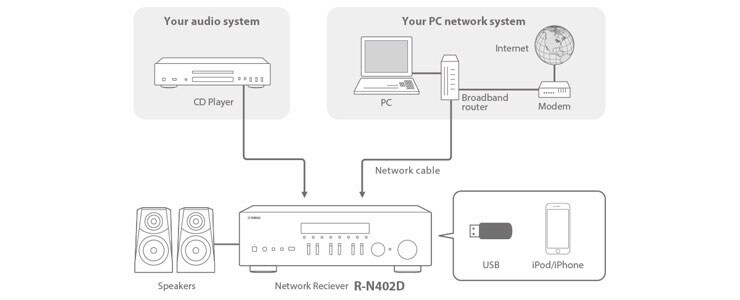 MusicCast employs a high performance wireless network to deliver music and audio enjoyment. It can stream digital music content from your smartphone, PC or NAS to other MusicCast devices in your home. It can also share the music from external devices such as a CD player or TV connected to the R-N402D. Audio content from Bluetooth-connected smartphones or tablets can also be streamed to MusicCast devices in multiple rooms.