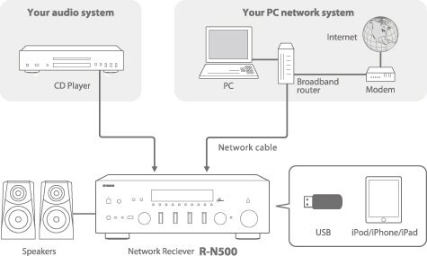 R-N500 — это ресивер и сетевой проигрыватель в одном устройстве. Он позволяет воспроизводить аудиофайлы, загруженные из Интернета и сохраненные на диске компьютера или в сетевой системе хранения данных. Можно также пользоваться сервисами потоковой музыки или слушать передачи Интернет-радио (через vTuner). Специальное приложение Yamaha NP Controller позволяет по беспроводному соединению проигрывать мелодии, хранящиеся на смартфоне или планшете.