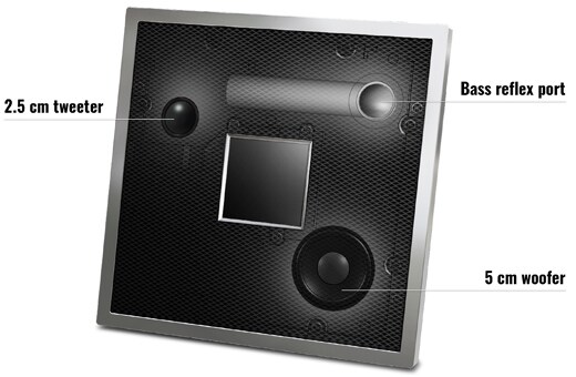Full, dynamic sound you wouldn’t expect from such a small package. The ISX-18D features a two-way, dual-speaker system with a 2.5 cm (1") tweeter and 5 cm (2") woofer. With a high-quality magnet and a special bass reflex port, the small enclosure puts out remarkably powerful sound with excellent bass response — taking full advantage of Yamaha’s famed audio expertise and technology.
