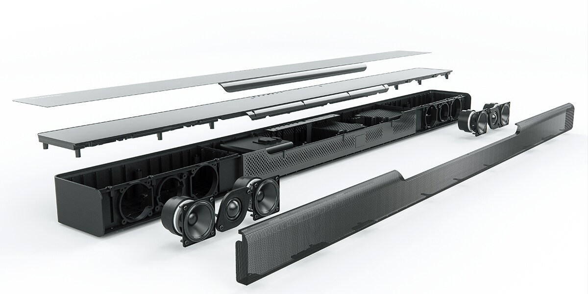 The slim profile allows for discreet placement in front of flat panel televisions without obscuring the screen.