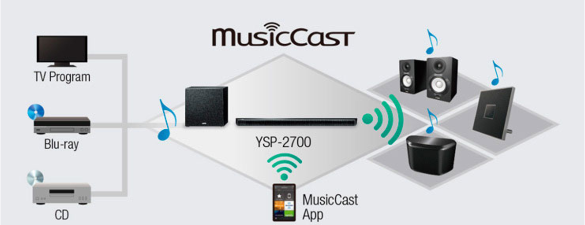 Система MusicCast основана на использовании высокоэффективной беспроводной сети передачи аудиоконтента, по которой цифровые музыкальные файлы со смартфона, ПК или сетевого хранилища можно передавать в потоковом режиме на другие находящиеся в доме устройства категории MusicCast. Предусмотрена также трансляция музыки с телевизора, Blu-ray проигрывателя и других внешних устройств, подключенных к YSP-2700. Возможна и потоковая передача аудиоконтента со смартфонов или планшетов, подключенных по технологии Bluetooth, на устройства категории MusicCast, находящиеся в других комнатах.