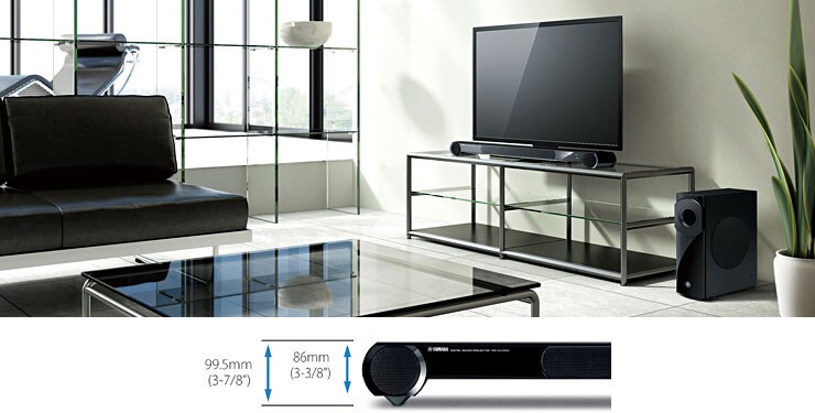 При высоте всего 86 мм YSP-3300 легко устанавливается перед телевизором, не закрывая экрана. С помощью опор высоту можно увеличить. Возможен настенный монтаж звуковой панели (кронштейны продаются отдельно).