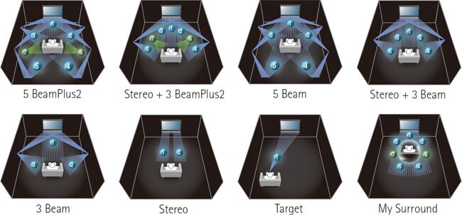 YSP-3300 обеспечивает пространственное звучание за счет отраженных от стен лучей звука, попадающих к месту прослушивания под разными углами. Основным является режим 5 BeamPlus2, имитирующий 7-канальный источник сигнала. Помимо него, предлагается и ряд других режимов прослушивания: 3 BeamPlus2 + Stereo, 5 Beam, Stereo + 3 Beam, 3 Beam, Stereo, Target и My Surround.