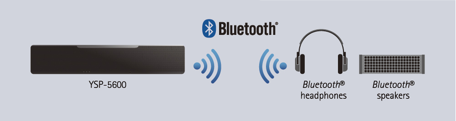 YSP-5600 оснащен новейшей технологией Bluetooth, делающей работу в беспроводном режиме удобнее, чем когда-либо прежде. Можно осуществлять потоковую передачу музыки с YSP-5600 на Bluetooth-совместимые наушники для индивидуального прослушивания или на Bluetooth-совместимые акустические системы.