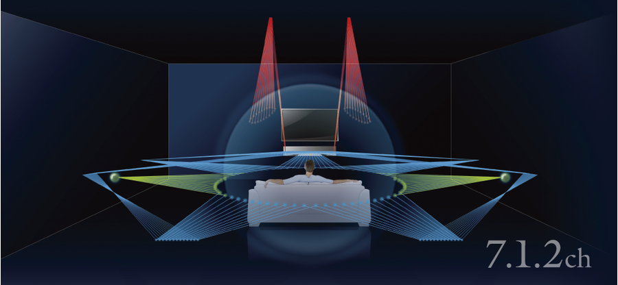 - По шесть излучателей канала высоты по обеим сторонам обеспечивают объемное звучание эквивалентное 7.1.2-канальной конфигурации.