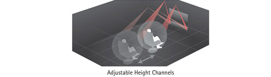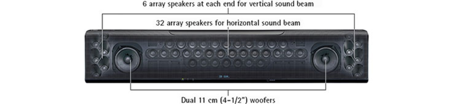 Два массива из шести излучателей (всего 12), расположенные по обеим сторонам передней панели, образуют канал высоты. Для этого использованы динамики диаметром по 28 мм. Для достижения максимального эффекта они смонтированы на акустическом экране, расположенным под углом, при этом можно контролировать направление звуковых лучей. Это создает аутентичное звуковое поле, как будто используются потолочная акустика — вы получаете прекрасное звучание, не связываясь со встраиванием акустических систем в потолок и прокладкой кабелей.