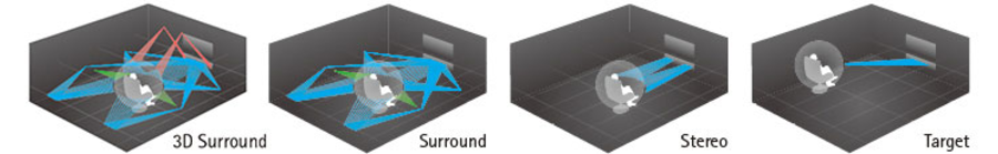 YSP-5600 имеет четыре режима прослушивания: 3D Surround, в котором задействованы пять горизонтальных лучей и два вертикальных для воссоздания эквивалента 7.1.2-конфигурации трехмерного звукового поля; Surround с пятью горизонтальными лучами дает стандартное 5.1-канальное окружающее звучание; в режиме Stereo специальный вертикальный излучатель выступает в качестве твитера, обеспечивая высококачественное стерео; и Target — монофонический режим для отчетливого воспроизведения речи с точной локализацией в пространстве. В режиме 3D Surround вы можете дополнительно выбрать CINEMA DSP 3D, а в режиме Surround — CINEMA DSP, которые являются продвинутыми вариантами того и другого, и обеспечивают более широкую звуковую сцену.