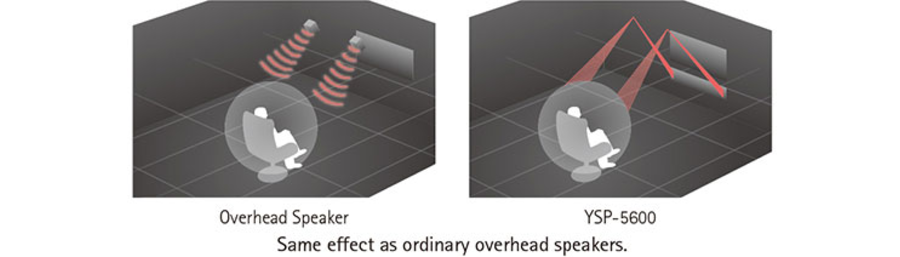 Каналы высоты могут находиться так же близко к слушателю, как и АС центрального канала, их местоположение и качество оказывают большое влияние на восприятие многомерного звука. YSP-5600 формирует каналы высоты с помощью направленных лучей, отраженных от потолка. Это дает эффект четкой локализации звука и позволяет реалистично воспроизводить природные звуки, такие как гром. Эти звуки настолько натуральны, что иногда даже вызывают оторопь.