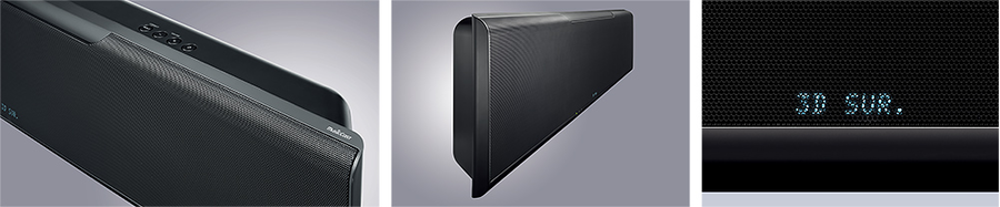 Передняя панель и секция индикаторов закрыта мелкой сеткой гриля, которая придает устройству простой и элегантный вид. По краям в верхней части гриль плавно закругляется, оставляя пространство для звуковых лучей, направленных вверх. Индикаторы загораются только в случае необходимости, чтобы не мешать просмотру. Ширина звуковой панели даже при наличии в ней излучателей вертикальной направленности составляет 1100 мм, то есть на 100 мм меньше, чем у предыдущей модели YSP-5100, а высота всего 93 мм (без подставки), что делает эту панель чрезвычайно компактной и удобной в размещении.