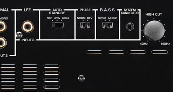 На задней панели есть переключатель B.A.S.S., позволяющий задать для характера звучания сабвуфера установку Music (Музыка) или Movie (Фильм). Выбор оптимальной установки зависит от используемого источника сигнала или конфигурации аппаратуры.