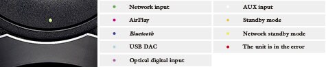 На передней панели NX-N500 имеется светодиодный индикатор, цвет которого меняется в зависимости от рабочего состояния системы: оранжевый — энергосберегающий режим ожидания, зеленый — сетевая функция, розовый — AirPlay, а голубой — USB-ЦАП, что позволяет быстро определять активный источник сигнала.