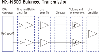 Симметричная схема устраняет внешние помехи, которые подмешиваются к сигналу. Цифровые аудиосигналы в NX-N500 подвергаются преобразованию в левом канале, затем подаются в правый. XLR-кабель обеспечивает симметричное соединение между акустическими системами. Такой подход способствует максимальному устранению шумов.