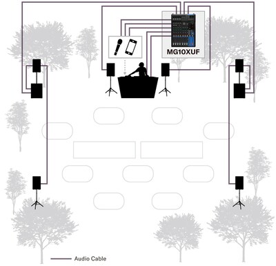 Эта конфигурация профессионального аудиооборудования на удивление мощная, для такой портативной и простой в настройке системы. Ее выходной мощности достаточно, чтобы обеспечить чистое и энергичное воспроизведение записанной музыки для выступлений диджеев и вечеринок среднего масштаба на открытом воздухе для аудитории до 100 человек в зависимости от расположения мест и размера площадки.