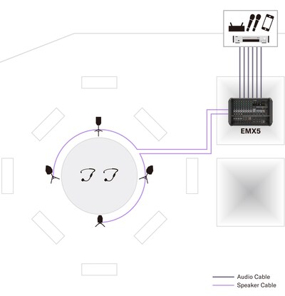 – Система состоит из микшерного пульта с усилителем и четырех пассивных громкоговорителей.